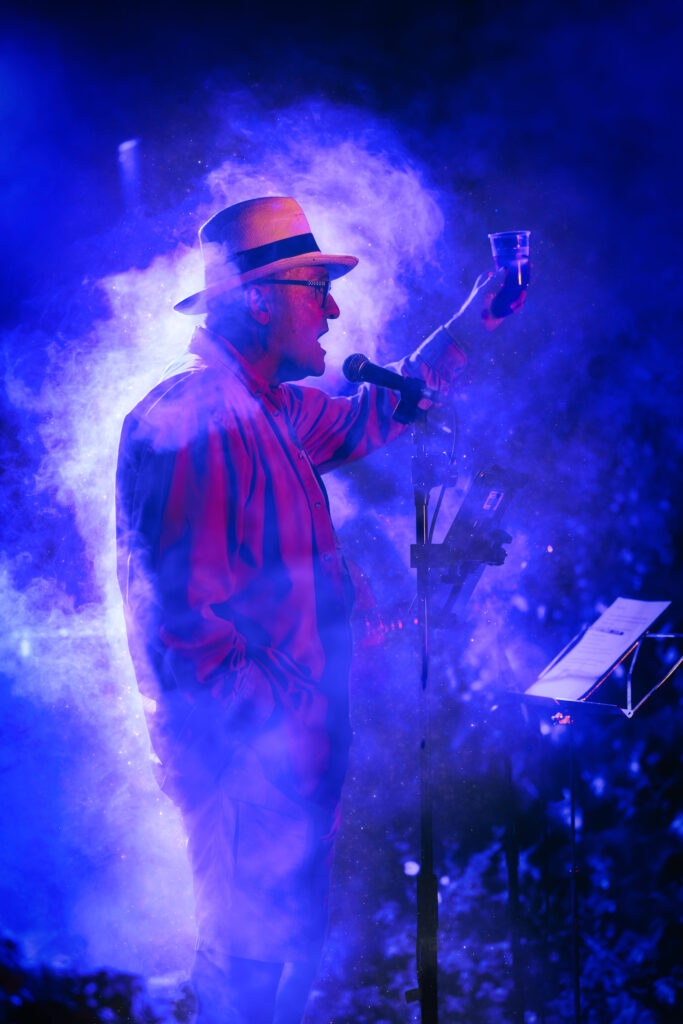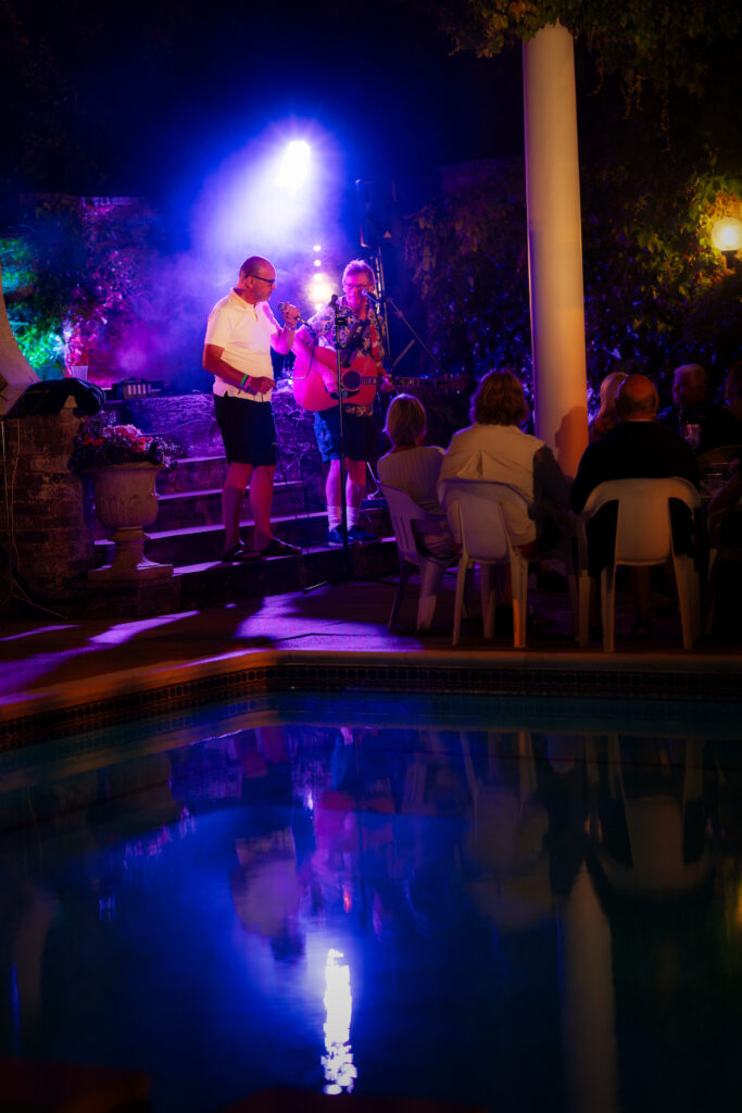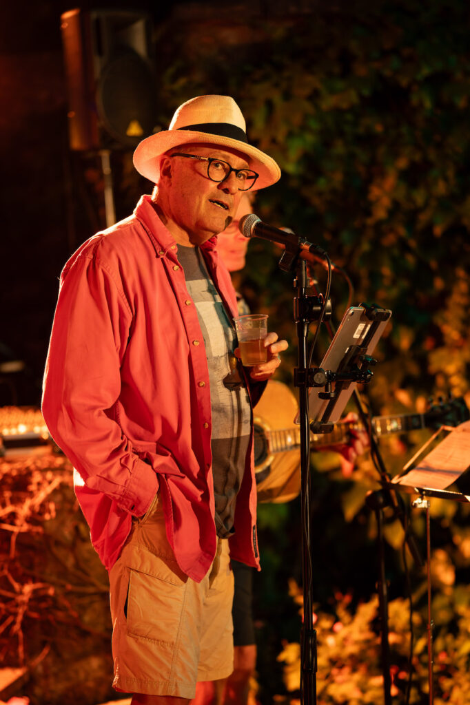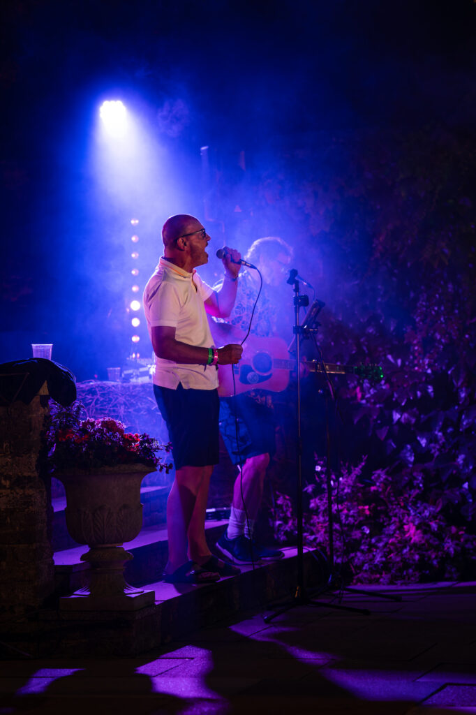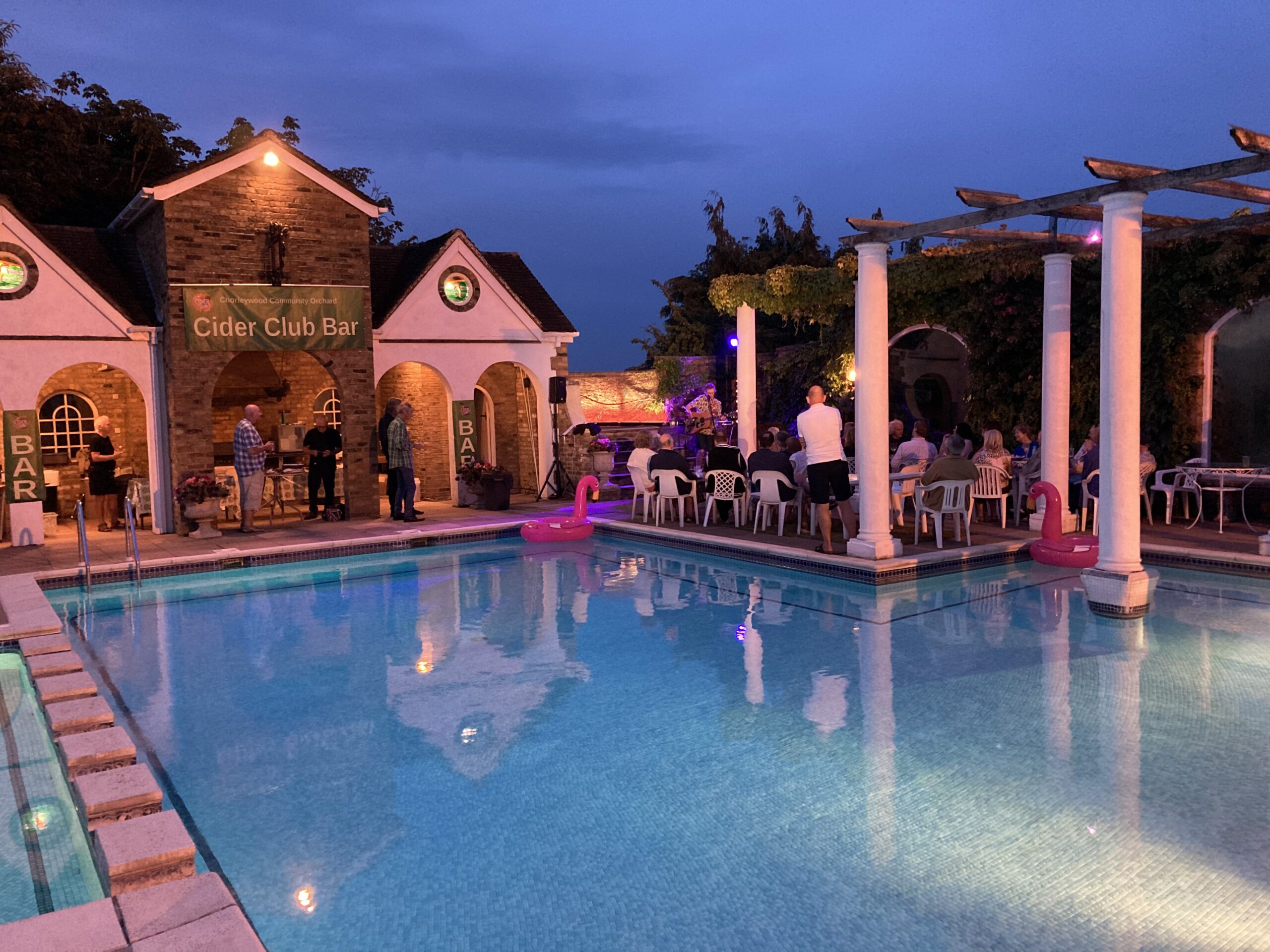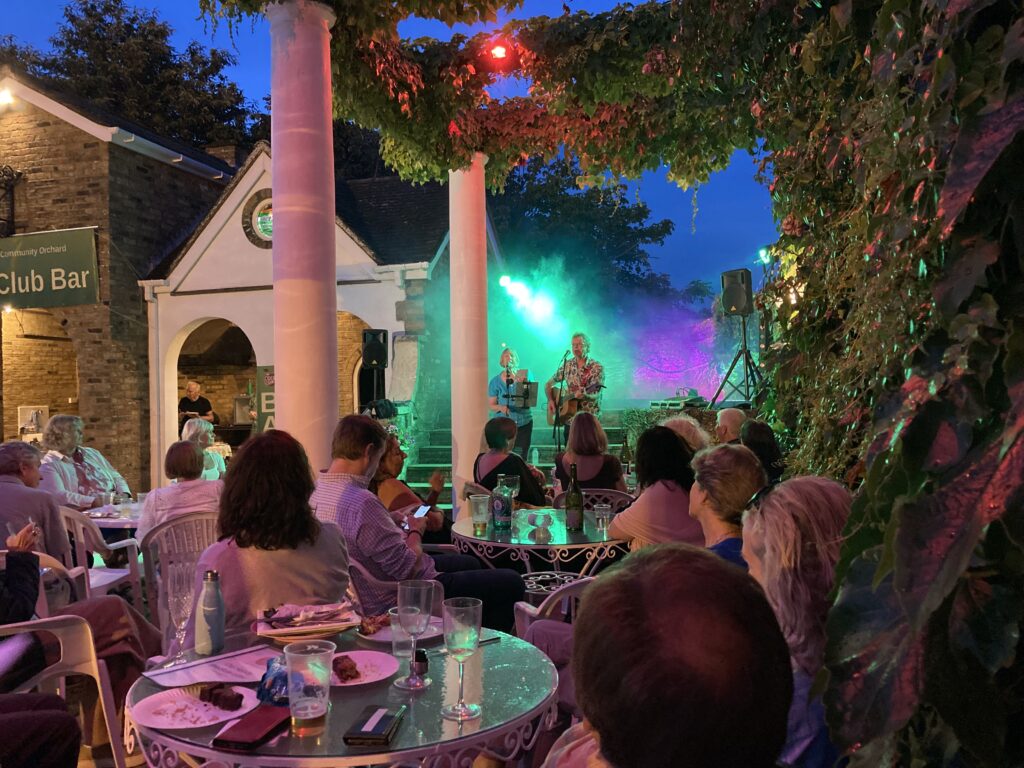This year’s party was indeed exceptional and we were so lucky with the weather! The equipment set up for the evening’s short entertainment set kept on getting delayed due to rain showers so we relied on Colin’s weather radar to tell us when it would stay dry. At that point the A team got all the sound and light equipment up and running in record time. Bob Visser went above and beyond with a fantastic light and smoke display and Viv Bartlett managed to get the music going without even having time for a sound check. Our Community Orchard supporters food offerings also surpassed all previous events bringing many fantastic dishes of food for all to share.